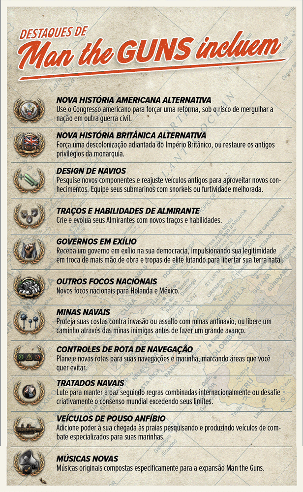 Man the Guns também introduz novos caminhos alternativos de história para as maiores democracias da guerra e também dá às nações amantes da liberdade do mundo mais liberdade para agir antes que a guerra force sua mão.
